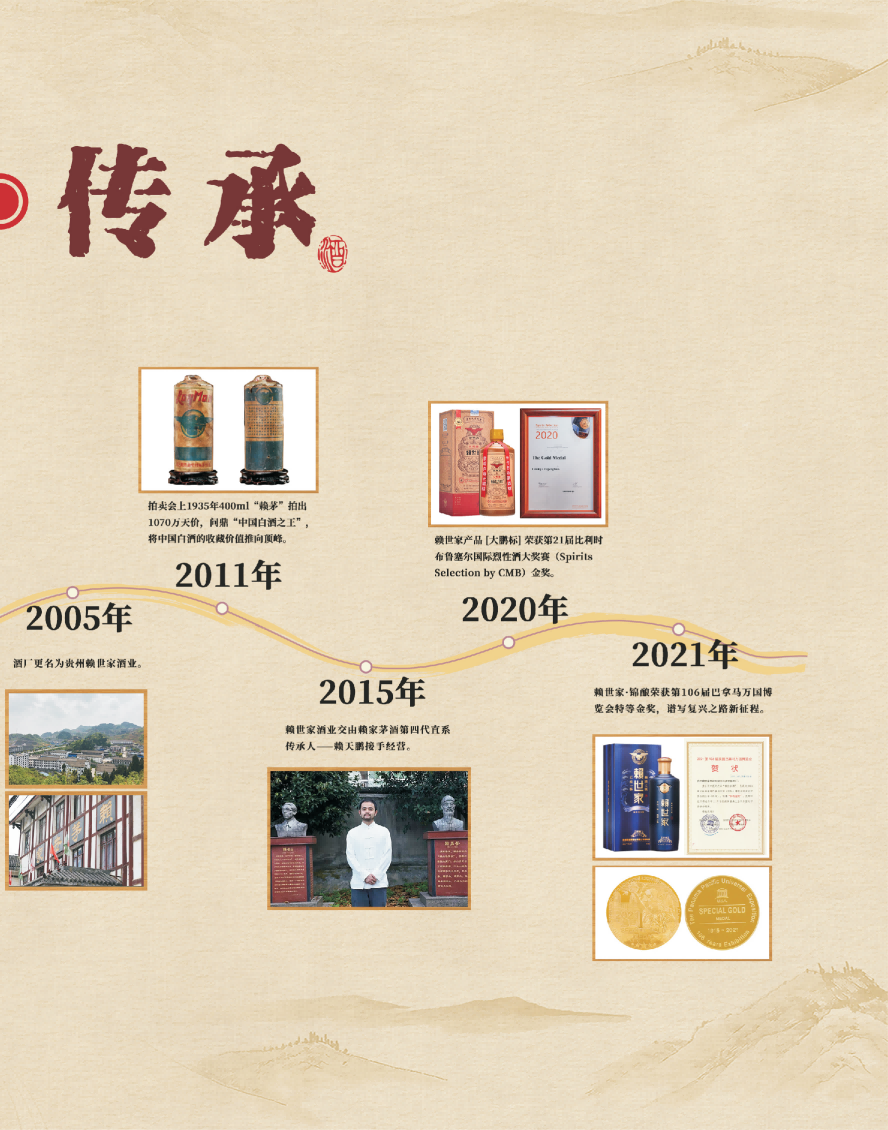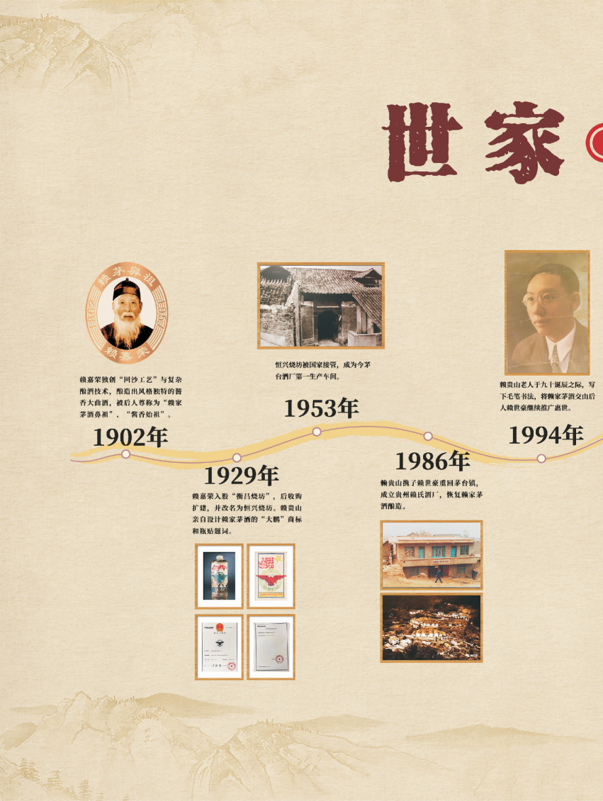 赖世家酿酒历史源远流长,1902年,赖氏祖辈赖嘉荣独创“回沙工艺”与复杂酿酒技 术,酿就风味独特的酱香大曲酒,自此奠定赖家百年酒业的技艺基石。