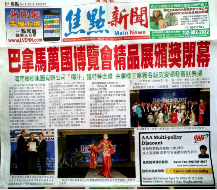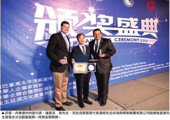 海南椰树牌椰汁荣获2016年美国巴拿马万国博览会颁奖盛典特等金奖!